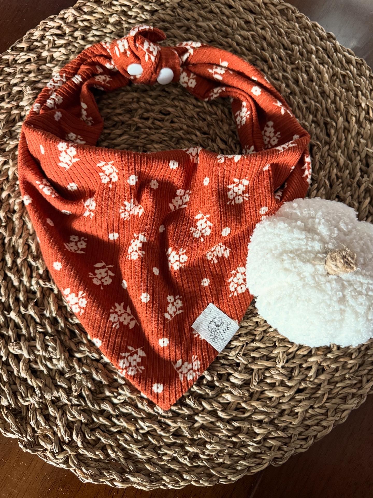 Warm, rustic, and full of fall charm — The Maple is the perfect bandana for autumn adventures. Made from a ribbed rust-orange knit with delicate white florals, it brings the cozy glow of turning leaves to your pup’s style. Soft with just the right stretch, it’s as comfortable as it is stylish.