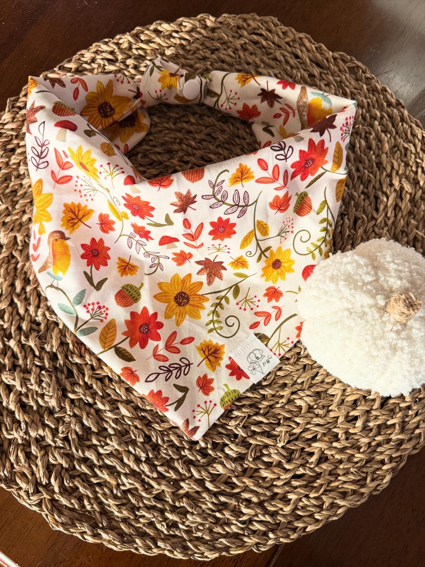 Celebrate everything you love about the season with The Autumn. This playful bandana features a whimsical fall print filled with sunflowers, squirrels, acorns, mushrooms, birds, and colorful leaves — all the cozy little details that make autumn magical.
