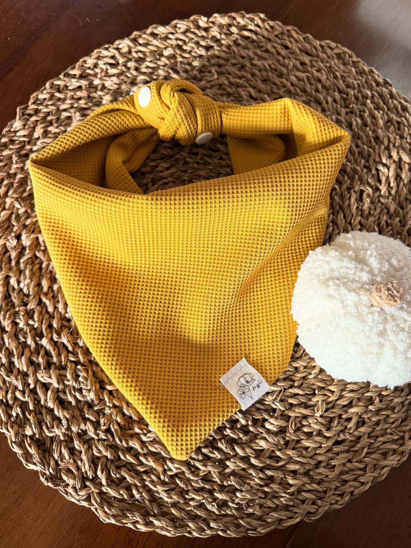 Named in memory of our beloved golden retriever, Poppy, this bandana carries a piece of her joyful spirit. The soft waffle knit in a warm mustard hue is inspired by the golden glow of fall — cozy, timeless, and full of heart. It’s the perfect accessory for celebrating the season with your pup.