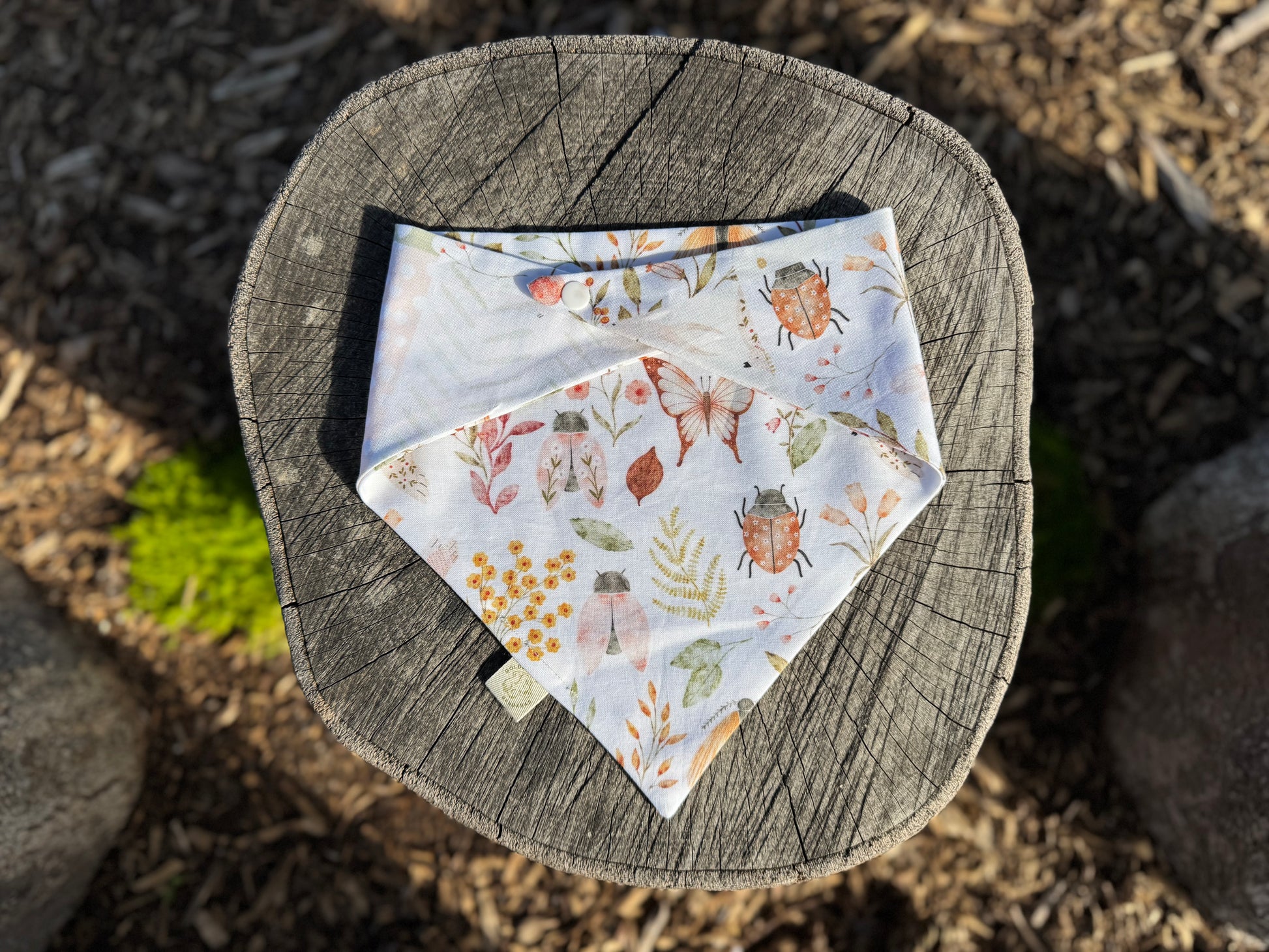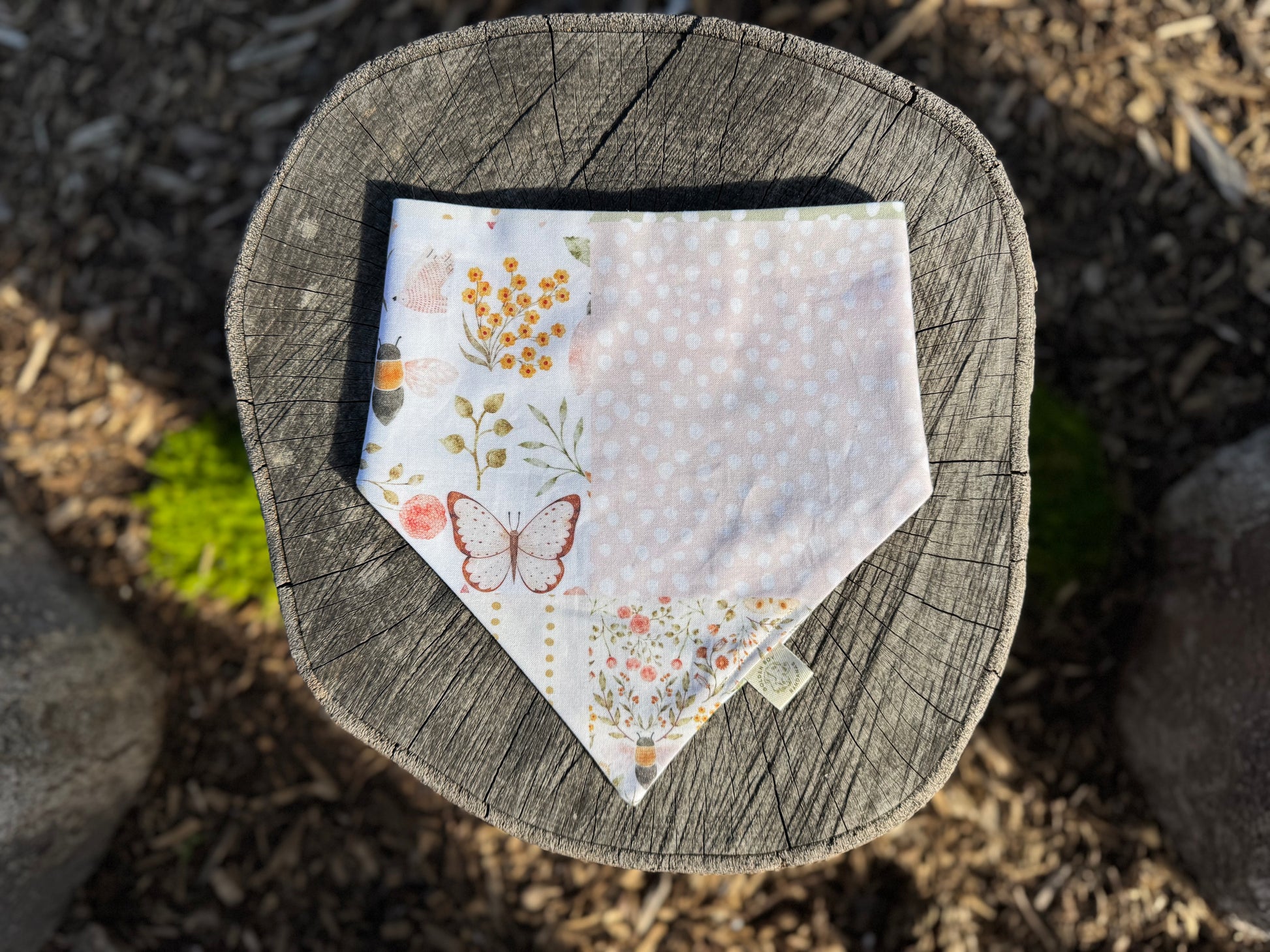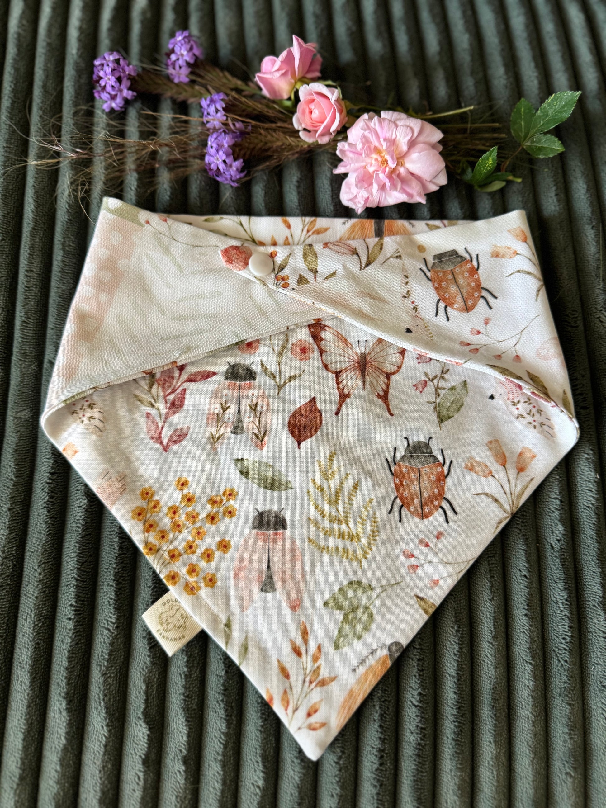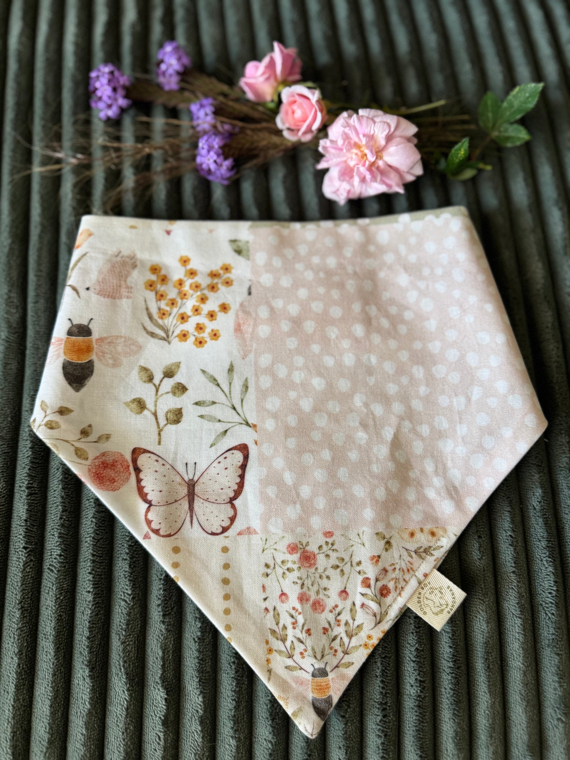 The most darling cottage-core bandana! An adorable patchwork print on one side and garden bugs on the other, in soft shades of pinks and greens. Named after our adorable rep, Harper the Mini Labradoodle!